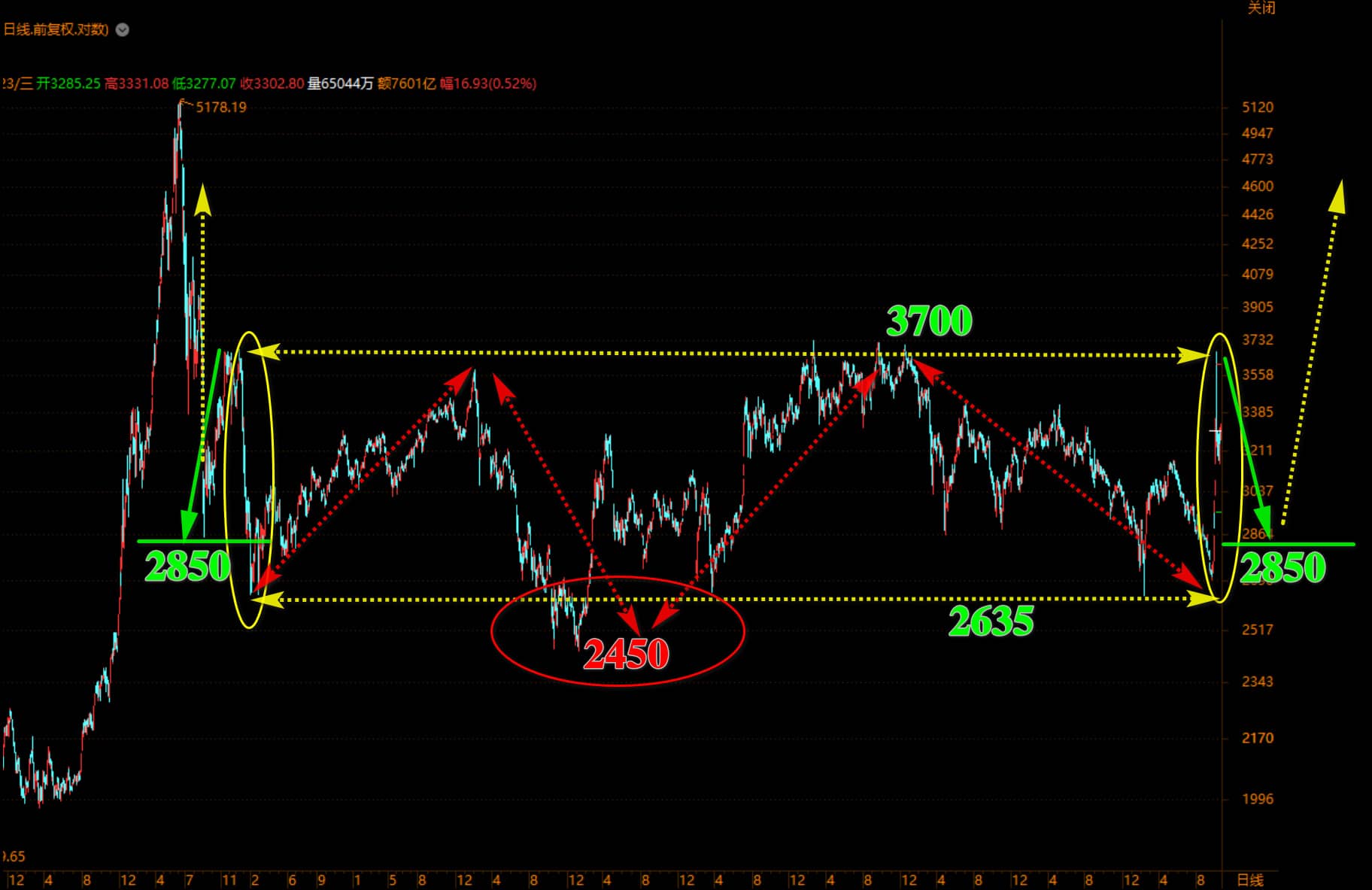 1、沪指经历了在2650和3700之间长达9年的震荡行情,此区间的初始高点和低点定义于2015年12月-2016年1月,终末高点和低点定义于2024年9月和2024年10月。