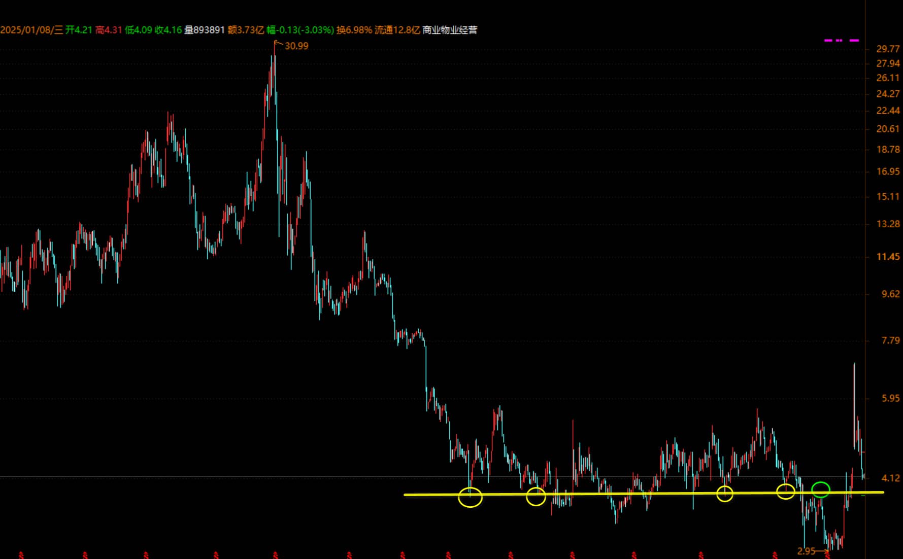 根据上图可知,002344高频转折点,基本位于3.8上下的区域,将此区域连线,得到一条横跨2018年到2024年的变盘线(魔方隐藏线索),此线可同时为支撑线和压力线,因为第五次转折时成了下行的压力线。那么当下便可以看出,目前4.16的价格(20250108午)大概率不会止跌,因为离3.8的高概率变盘线,还有至少一个跌停的距离。