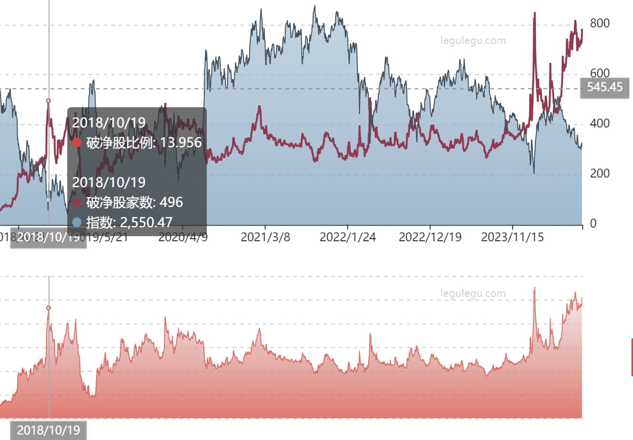 当缺少判断底部的工具时,可以用破净股代替,2018年10月19日破净股数量为500(3500个个股),破净率14.2%,那么可以同理推出现在5500个个股的当下,当破净率达到14%,破净股数量高达770的时候,亦是接近底部的时候,数据显示2月初和7月底这两个时点的破净股水平,已能和2018年10月不相上下,因此有理由相信该区域已经进入了传统熊市极端底部的范围,但没有出买点。
