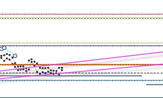 下图:上证指数与附近的支撑压线示意图。两条洋红色斜趋势线仅做方向线连线使用,对支撑判定作用不大,支撑判定基本来自横线,尤其是墨色中空线。